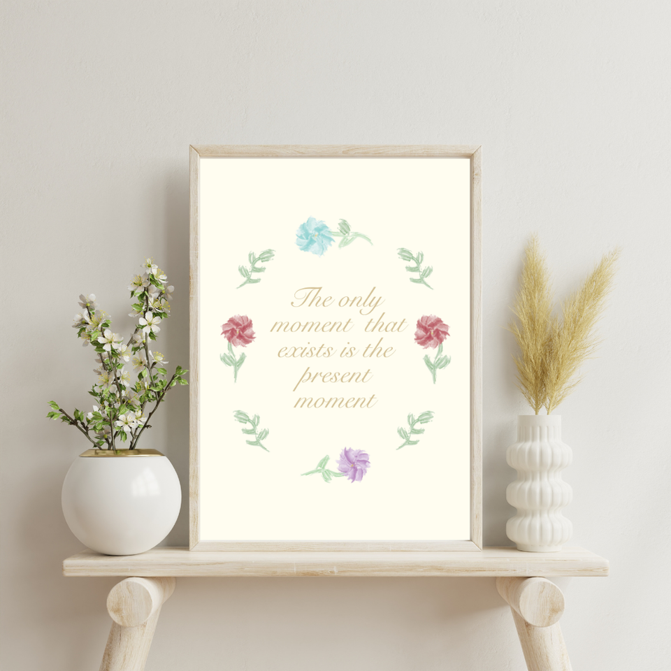 פוסטר בעיצוב עדין עם איורי פרחים והכיתוב: "The only moment that exists is the present moment"
